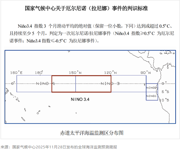 厄尔尼诺与南方涛动合称为ENSO,它是热带太平洋海气相互作用现象,包含厄尔尼诺(暖相位)和拉尼娜(冷相位)两种模态。拉尼娜状态并不必然发展为拉尼娜事件,当拉尼娜状态持续时间大于和等于5个月,判定为形成一次拉尼娜事件。